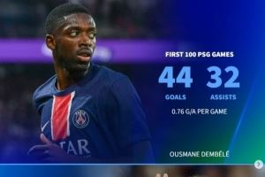 登贝莱巴黎百场44球32助,但同期效率仍低于内马尔、伊布、姆巴佩